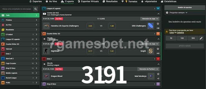 O 3191 oferece uma grande seleção de opções de apostas em e-sports com probabilidades competitivas